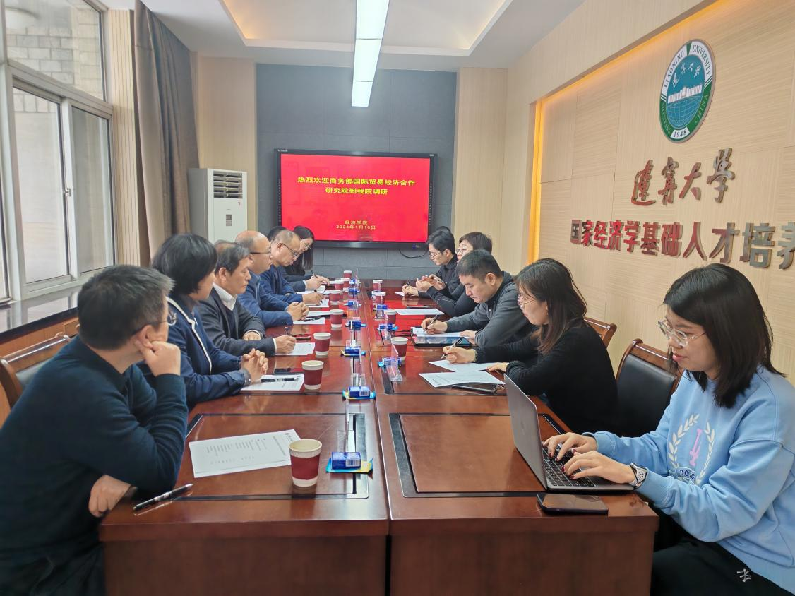 2024年1月10日,商务部国际贸易经济合作研究院党委副书记兼纪委书记于蓉,教育合作办公室副主任卫平东,博士后办公室副主任邵宇佳,教育合作办公室干部王丹蕾到ok138cn太阳集团开展调研座谈,就硕士研究生、博士后联合培养、学科建设与科研合作等事宜进行了交流。ok138cn太阳集团党委书记王冰,ok138cn太阳集团党委副书记、院长李政,国际经济政治学院院长刘文革,中国商务发展研究院(北京)副院长邢源源,环境经济研究所所长叶满城,ok138cn太阳集团副院长和军,环境经济研究所副所长陈芙参加了会议。ok138cn太阳集团党委书记王冰主持了座谈会。